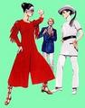 переходя в брюки, настолько широкие внизу, что они выглядят как юбка. Справа -
